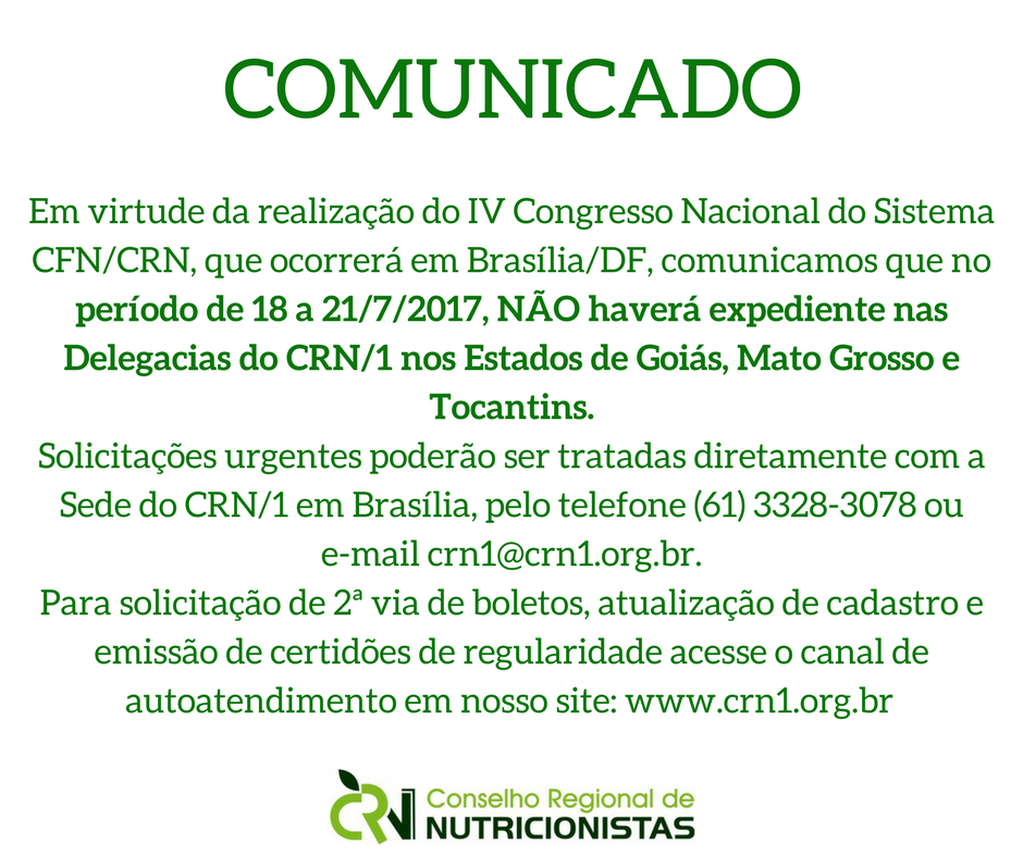COMUNICADO – Funcionamento Delegacias CRN-1 de 18 a 21/07